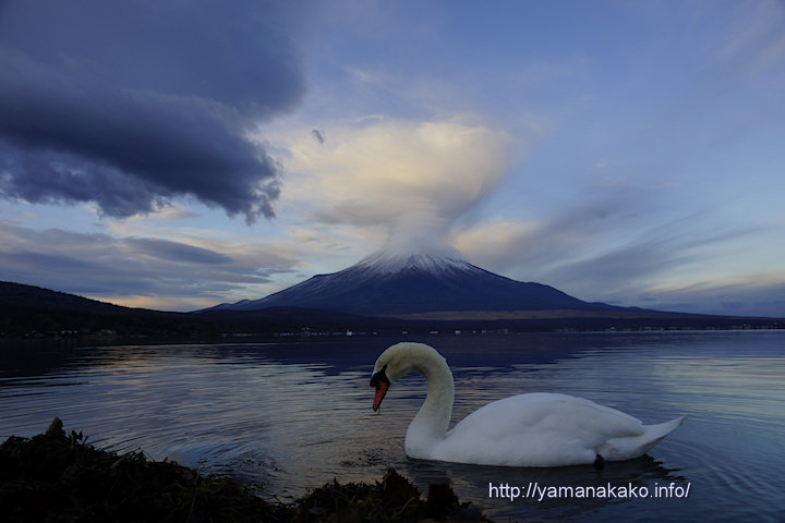 今朝は富士山頂に雲がかかり、帽子を被っているようでしたが、白鳥が近くにやってきたときは、後ろの雲と重なってしまいはっきりわからなくなってしまいました。この後はどんどんと雲が大きくなり、10時過ぎには富士山をすっぽりと覆ってしまいました。先週に比べて雪が少なくなっていましたが、この雲でまた雪が増えることでしょう。