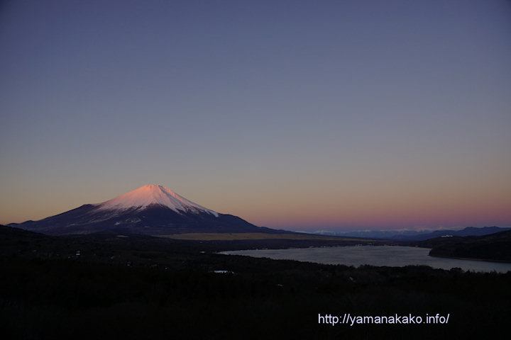 富士山に日があたる前から南アルプスの上は染まり始め、富士山がピンク色になりはじめた時には写真のようなきれいなグラデーションの空(ビーナスベルト)が見られました。空気が澄んでいるこの時期だからこその景色で、他の季節で見た記憶にありません。