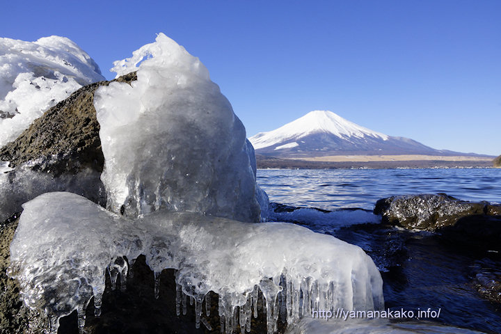 きらら前の湖岸にある岩にへばりつく氷が、一時期気温上昇のためなくなっていましたが、ここのところの寒さでまた少し復活し、まだ今朝はたくさん残っていました。