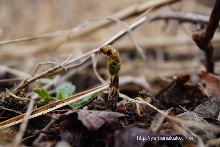 今日は朝から雲が多めで早朝見えていた富士山も、9時頃にはすっかり雲に遮られて見えなくなってしまいましたので、つくしを探しに行ってきました。最初に行った場所では発見できなかったものの、別の場所には写真のつくしが1本だけ見つかりました。時期的にはだいたい例年通りで、雪が降ったりしてまだ寒い日が多いですが、春はすぐそこまで来ているようです。