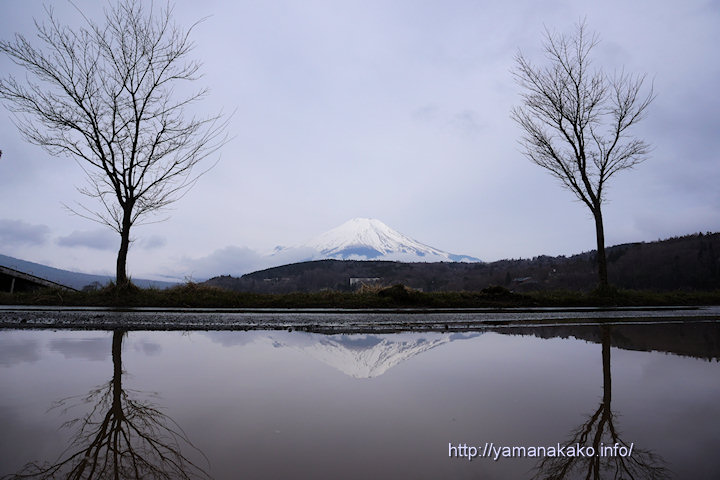 今日は朝から曇り空でしたが、9時頃には富士山の前にあった雲がなくなり、昨日から雨が降ったり止んだりしてできた水たまりに、逆さ富士が映って見えました。
