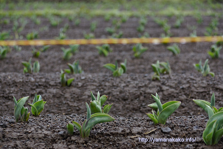 花の都公園のチューリップの芽が、4月初め頃から出てきて、写真のように10cmほどに育ってきました。今年は3月が寒く下旬に大雪となったりして、春の訪れが遅くチューリップの成長も遅れているようなので、咲き始めるのはまだまだ先です。