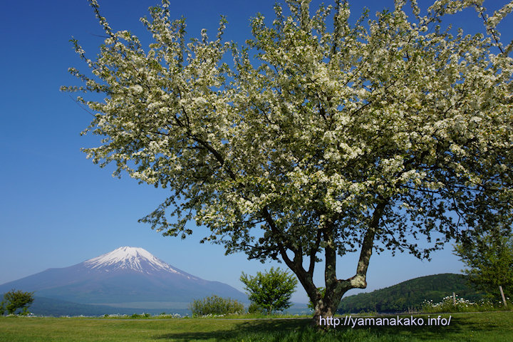 きららのズミの花山中湖交流プラザきららの原っぱにあるズミの花がまだ咲いています。27日頃が満開だったので、今朝はもう花がないかと思っていましたが、写真のようにまだ白い花が咲いていました。ここは芝生の緑と白いズミの花、そして富士山が見える場所で、今の時期はとても人気のスポットとなっています。