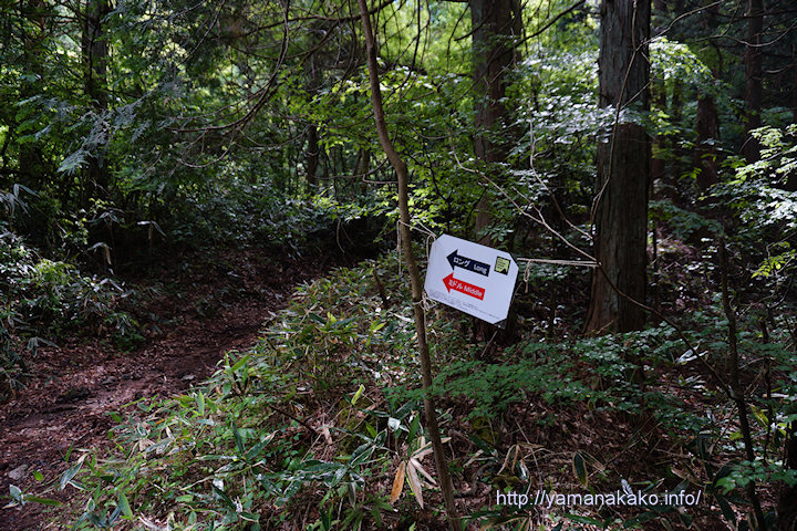 富士忍野高原トレイルレースの標識6月4日は、第8回富士忍野高原トレイルレースが開催され、平尾山から大平山付近はそのコースで、多くのランナーが走りますので、ハイキング予定の方はご注意ください。トレイルコースには写真のような標識とピンクの帯が所々にあります。
