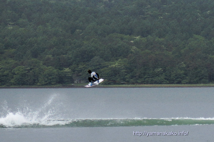 明日からウェイクボードのプロアマ大会「東日本ブロック山中湖大会/ウェイクシリーズ第2戦 Lake Yamanaka Champion ship」が開催される予定で、今朝は練習で何艇かが出ていて、アクロバティックで華麗な技を決めていました。