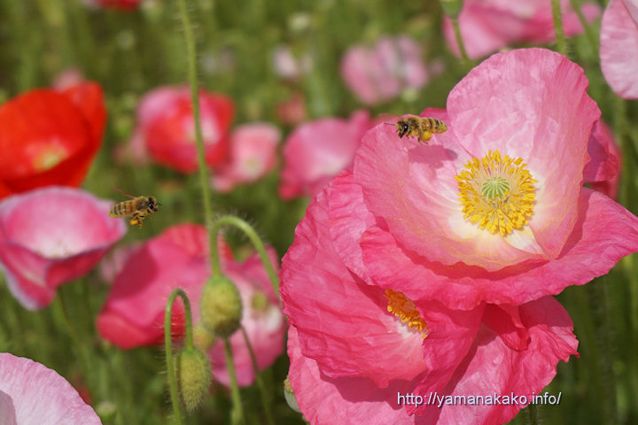 久しぶりに朝から日差しがあり青空が見えていましたが、富士山は見えなかったので、花の都公園の花の開花状況を見てきました。9日に紹介したキカラシ畑では満開となっていて、そのほかの畑でもキカラシが咲き始めてきましたので、もう少し経つと黄色い絨毯のようになるでしょう。また2日に投稿したポピーはまだきれいに咲いていて、今朝はミツバチが飛び交っていました。