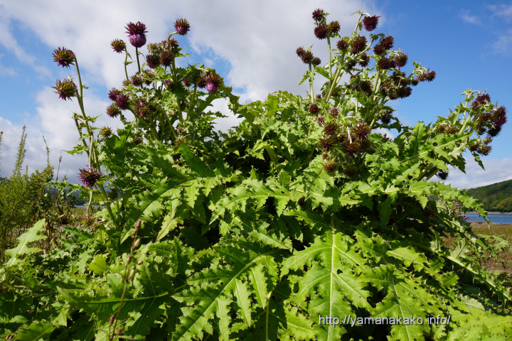 以前にも紹介したきらら前のフジアザミが、だいぶ咲いて見頃となってきました。写真のものはまだ咲き始めのここにある中で一番大きな株で、少し台風の影響を受けたようで、この反対側では葉がめくれていましたが、大きな影響はなさそうです。
