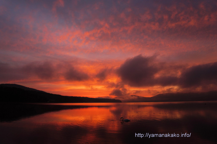 今朝は雲が多めで日の出前に写真のようなきれいな朝焼けが見られ、空も湖も真っ赤に染まりました。とっても小さいですが白鳥も写っています。