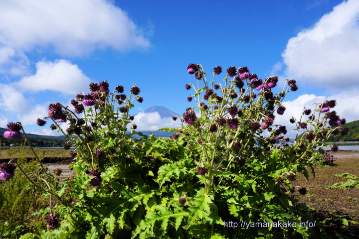 10日前に紹介したきらら前のフジアザミの一番大きな株は、写真のようにちょうど満開となっています。晴れてきれいな富士山が見えていると、たくさんのカメラマンがいるのですが、今朝は急に晴れてきて山頂しか見えなかったので他には誰もいませんでした。