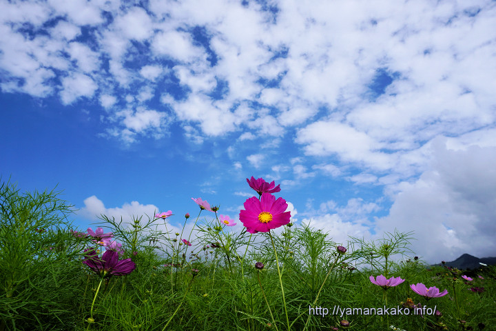 今朝も早朝に富士山が見えましたが、6時過ぎには雲に覆われて見えなくなってしまいましたので、9時頃に花の都公園の開花状況を見てきました。先日まで満開だったひまわりは大部分が下を向いてしまい美しくありませんが、キバナコスモス(オレンジフレア)や百日草、サンパチェンスは見頃となっています。そしてコスモスも咲き始めてきたので、秋らしい雲の下に咲く様子を撮ってみました。