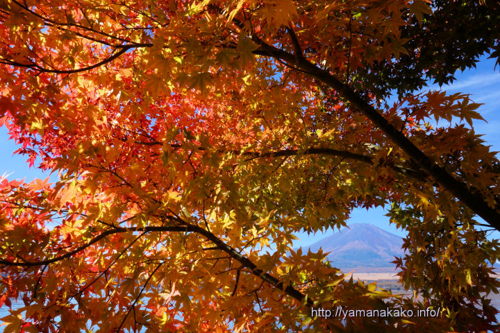 山中湖周辺の紅葉が見ごろを迎え、赤や黄色に色付いていてとてもきれいです。紅葉まつり会場の旭日丘湖畔緑地公園も見頃で、ちょうど会期の真ん中にさしかかり、これからピークを迎えるところです。