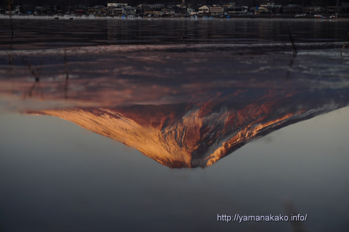一昨日の投稿と同じように、今朝も湖の縁が凍っていました。まだ氷が薄く、氷が割れているところから上に水が乗ると鏡面になり、きれいな逆さ富士が見られます。ただ、その上に乗った水もまた凍ってしまうので、刹那の逆さ富士で、13日の投稿と同様に寒いからこその現象です。