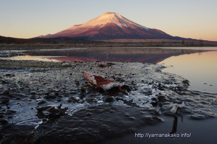 凍てつく山中湖畔今朝は冷え込み湖の縁が凍っていて、そこに落ちていた葉っぱには、白いひげのように霜が付いていました。これからさらに寒い季節となりますが、寒いからこその現象を発見するのもなかなか楽しいです。