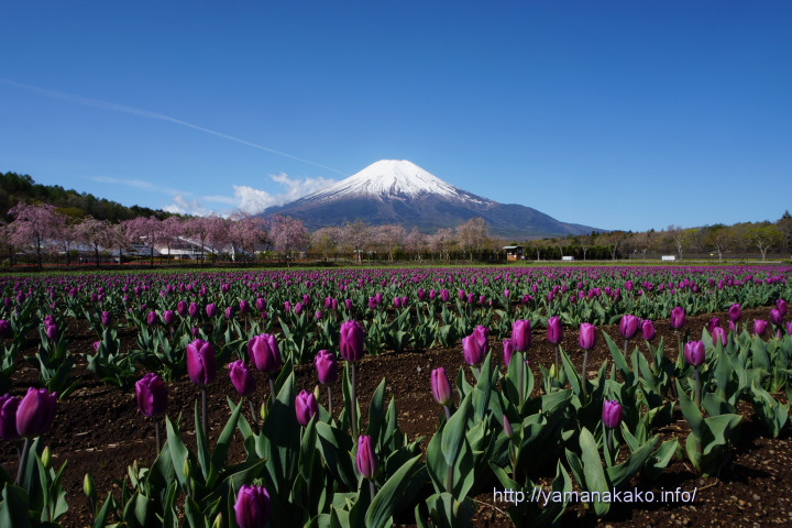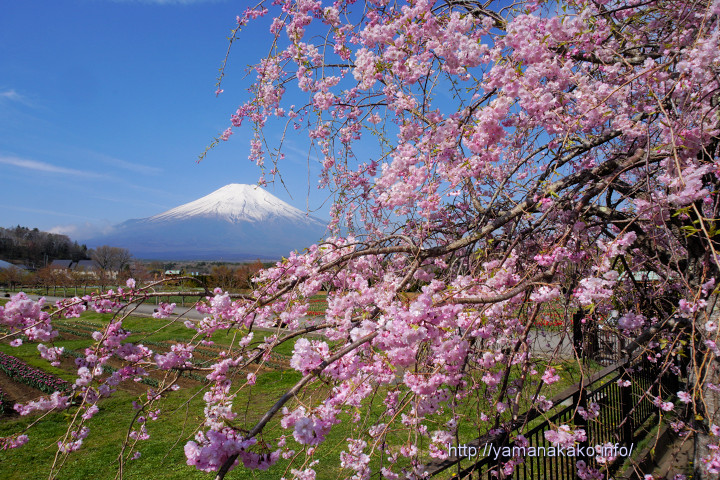 昨日紹介した花の都公園の八重紅しだれ桜ですが、下から見るとこんな風に桜のトンネルになっています。日曜日はこの下をたくさんの人が写真を撮りながら歩いていましたが、今日は曇り空で富士山は見えず開園間もない時間だったので、誰もいませんでした。