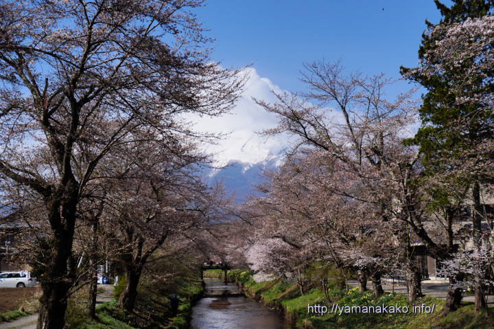 忍野村内を流れる新名庄川沿いの桜が、まだ一分咲き程度ですが咲き始めました。ここはいつも開花の定点観測している桜とだいたい同じようなタイミングで咲いていますが、忍野村内の他の場所では五分咲き程度のような感じです。