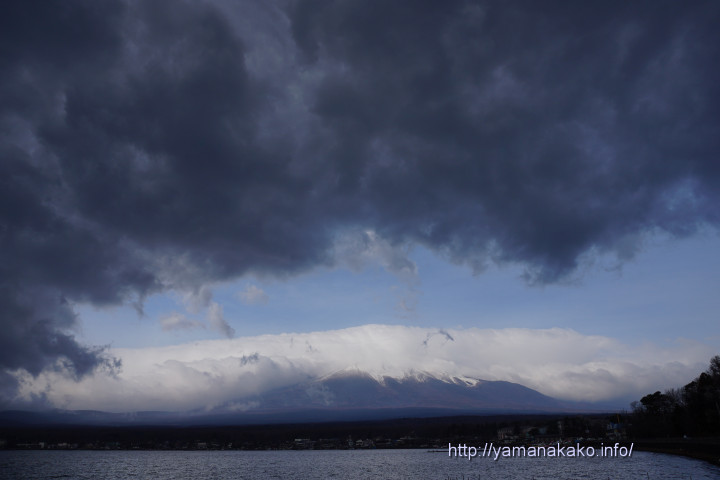 朝7時頃まで富士山頂は見えていましたが、だんだんと笠雲がかかってきて、8時半頃には五合目ぐらいから上は雲に隠れてしまいました。そして山中湖上空には不気味な灰色雲がかかってきて雨が降り出してきました。