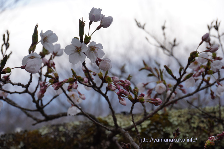 花数は昨日の倍ぐらいになり、木の上の方も開花してきて、この辺りでは三分咲きぐらいとなっています。山中湖全体ではやっと咲き始めといったところでしょうか。