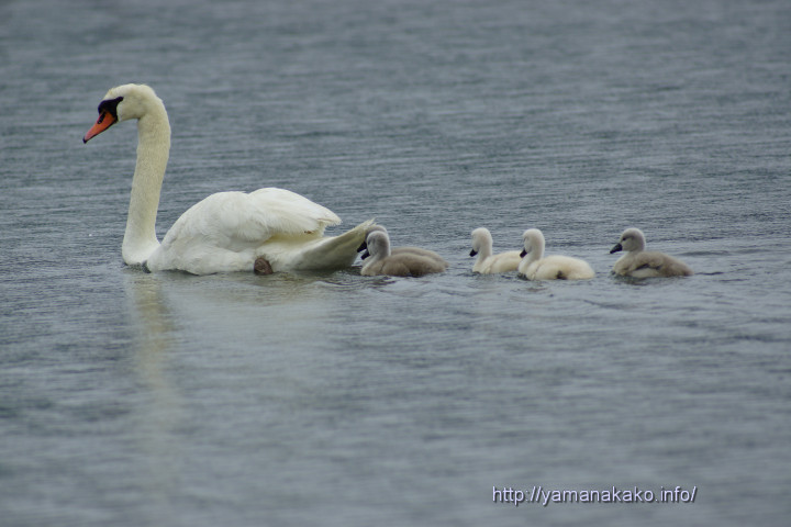 10日ほど前に孵化した白鳥のヒナたちは、雨の中を親鳥に付いて泳いでいました。みにくいアヒルの子という童話があり、そこでは白鳥のヒナは色がグレーでみにくいことになっていますが、写真のように最初から白いヒナもいます。白鳥のヒナを見かけたら、羽色を気にしてみてください。もう少し大きくなったらかなり違うように見えると思います。
