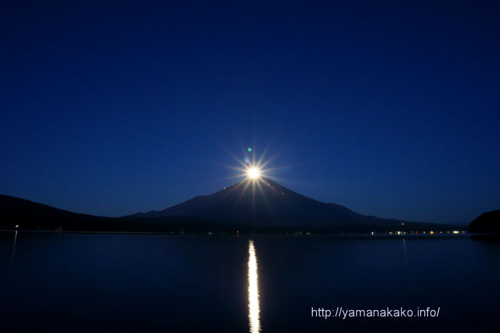 今日は富士山頂に月が沈むパール富士が、平野湖畔で見られました。その時間は午前4時半頃でしたが、4時前に着いたらすでに駐車場はなく、ベストポジションは三脚が並びたくさんのカメラマンがいて、撮影できなかったので、少々左側に沈む場所で撮ってみました。