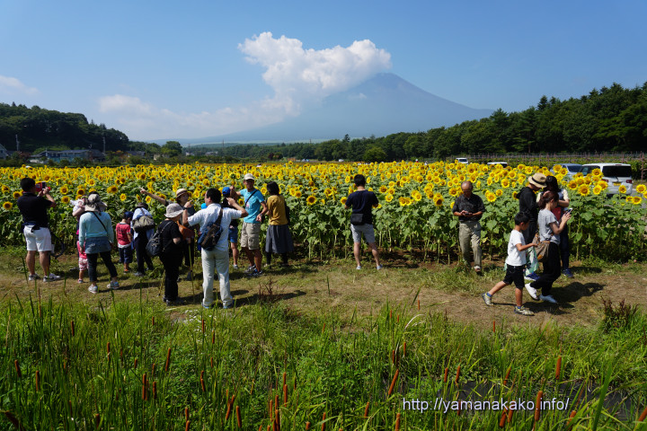 早朝は曇っていて富士山は見えませんでしたが、8時頃から晴れてきて霞んではいるものの富士山が見えました。花の都公園ではひまわりが満開となっていて、朝早くから多くの人で賑わっていました。