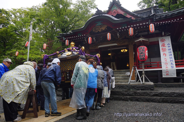 18年09~12月 安産祭り準備 2018年9月3日 山中湖人 コメントする 明日9月4日から行われる安産祭りに向けて、9月1日早朝に明神山頂上にある諏訪神社奥宮で、豊玉姫命の降臨を願う奥宮祭が行われました。また本日9時より雨の中、氏子による祭典準備が行われ、神輿や庭の清掃、注連縄飾りなどが行われました。 昨日の最高気温は20.2度で涼しい1日となり、今朝の最低気温は17.5度で昨日より高くなったものの、昨日に続き未だに20度以下の涼しい日となっています。 午前11時の状況 気温:19度 天候:雨 Tweet Check Share on Tumblr