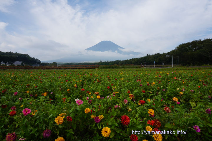 百日草畑より昨日、大きな木が倒れていましたが、昨日中に片付けられていたようで、今朝は根が残っていただけでした。園内の花々も台風の影響を受け、比較的風に強い百日草やサンパチェンスも花が少なくなっていて、百日草は富士山を背に斜めになっていました。