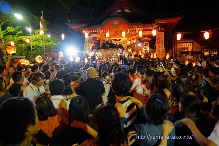 安産祭りのクライマックス安産祭りは一昨日とは違いいい天気に恵まれ、一昨日から御旅所に1泊した神輿は、昨日の18時半頃に御旅所を出発し、村中を練り歩き、23時前に子宝成就や安産祈願をするたくさんの人とともに諏訪神社境内に到着し、境内で御神歌を唱えながら1時間弱練り歩き、24時前に終了しました。