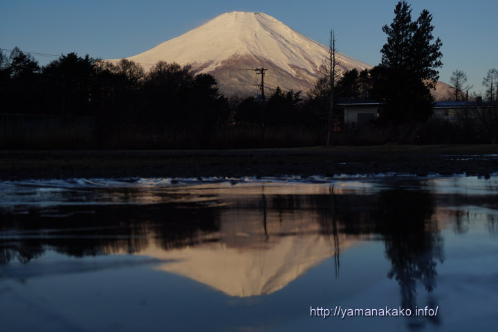 今日は朝からきれいな富士山が見られ、昨日降った雨でできた水たまりに氷が張り、そこに逆さ富士が見られました。水たまりの氷は平らでは無いところが多く、なかなか逆さ富士は見られないんですが、この水たまりは比較的きれいに見えました。