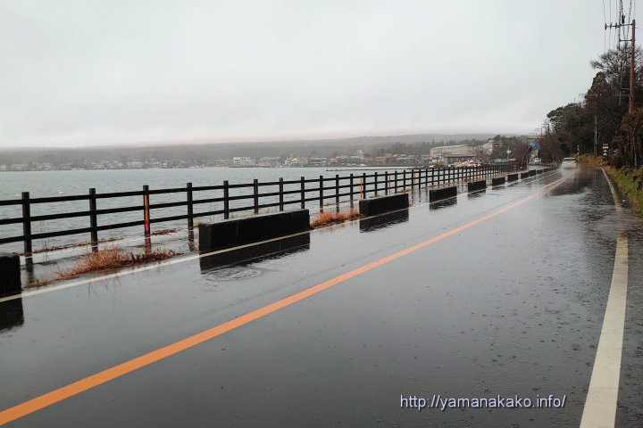 雨の山中湖12月中旬で雪が降って当たり前の時期ですが、今日は雨が降っていて、止んでからもあまり気温は下がらないようなので、路面凍結にはならないようですがどうでしょう。