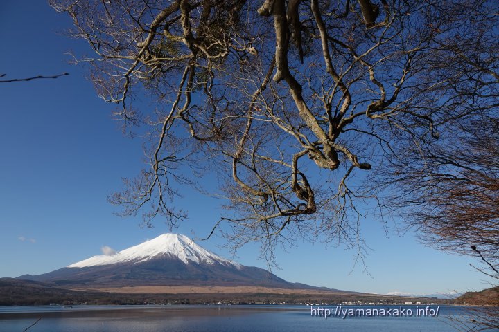 湖畔の木の下から望む富士山今日は朝からいい天気で富士山もよく見えていたので、お気に入りのくねくねの枝を入れて富士山を撮ってみました。この木は少し斜めに立っているので、枝が上に伸びようとしているようで、途中から鋭角に曲がっています。