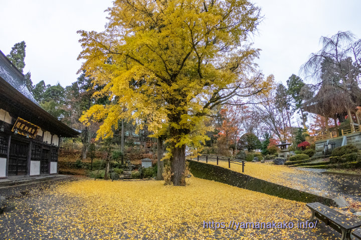 平野にある寿徳寺の大イチョウの黄葉がちょうどきれいで、木の下には黄色の絨毯を敷き詰めたようになっています。また山中明神前交差点近くの道路脇にある袈裟がけの大イチョウも、真っ黄色に染まっています。イチョウの葉が落ち始めると、山中湖周辺の紅葉は終盤になってきます。