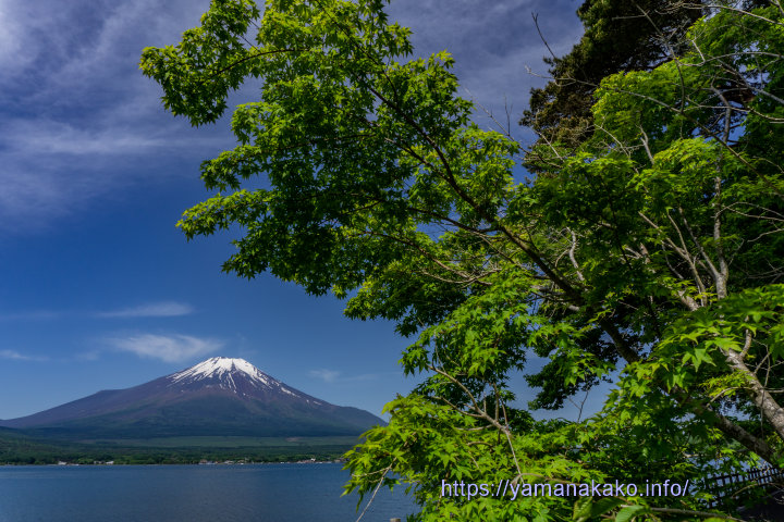 新緑と富士山今日も朝からいい天気で富士山もよく見えていて、この場所ではもみじにちょうど日が当たり始めた頃で、新緑が鮮やかでとてもきれいでした。