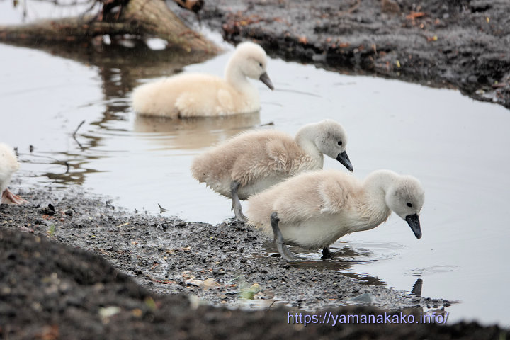 白鳥のヒナたち今年もコブハクチョウのヒナが先週から孵り始め、4箇所でヒナが確認できていますが、今朝はなかなか見つけることができず、湖の岸辺にいる家族にやっと会えました。並んで水の中を見つめていますが、何かあるのかな~?