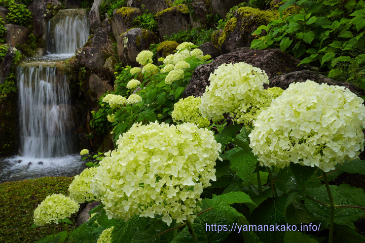清流の里のアナベル今年も花の都公園の清流の里内で、アナベル(アジサイ)が咲き始めました。まだ花が緑色の部分も多いですが、だんだんと白くなってきて間もなく見頃となりそうです。