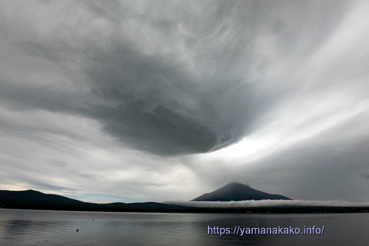 富士山にかかる吊るし雲 昨日は青空の中に吊るし雲が見られましたが、今日は曇り空で小雨降る中で、大きな吊るし雲が見られました。色のないモノクロームの世界で、なんか不気味な感じです(^_^;)。