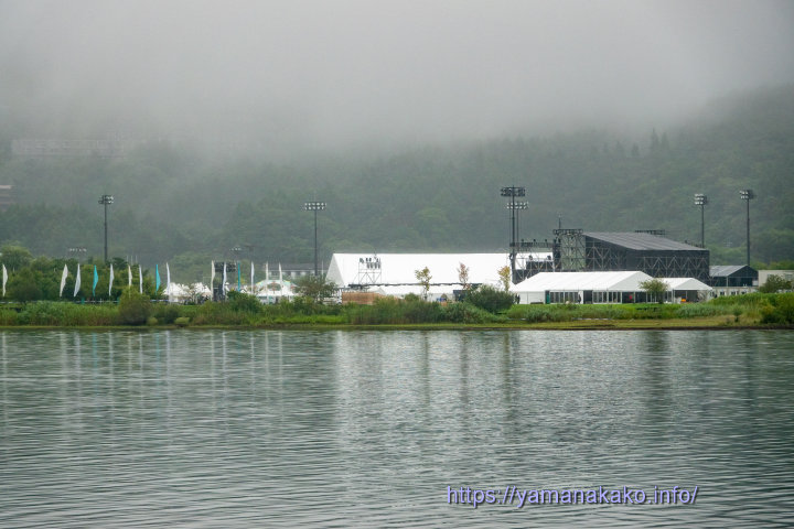 対岸から見たきらら 明日から日曜日まで山中湖交流プラザきららでSweet Love Shower 2022が開催されます。今週初めぐらいから準備が始まり、今朝も大型トラックによる機材の搬入等、最終準備が行われていました。開催期間中はきららには入場できませんのでご了承ください。