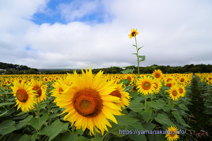 見頃となったひまわり畑 今朝は曇り空でしたが富士山が見えたので、もう一度ひまわり畑に行ってきました。1日しか経っていないのに、まだつぼみのところはあるものの、写真のように見頃となっていました。しばらく天気が悪いようですが、満開のうちに富士山が見られるでしょうか・・・