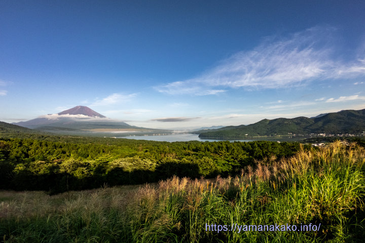 パノラマ台から望む今日は曇りの予報で早朝の暗いうちは、雲に遮られて見えなかった富士山ですが、日の出の頃から晴れてきて、6時半頃には写真のように見えました。ここから写真とは反対側の明神山山頂まではススキが穂を出し、秋の気配を感じます。
