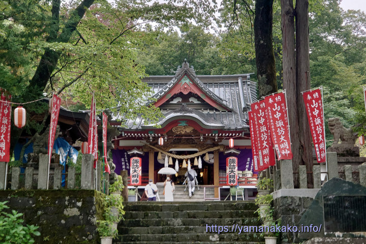 奥宮祭が行われました雷鳴とどろき激しい雨の中、神主をはじめ祭典委員が明神山に登り、準備が完了した頃には雨も小降りになり、安産祭りの祭神・豊玉姫命の降臨を願う奥宮祭が行われました。