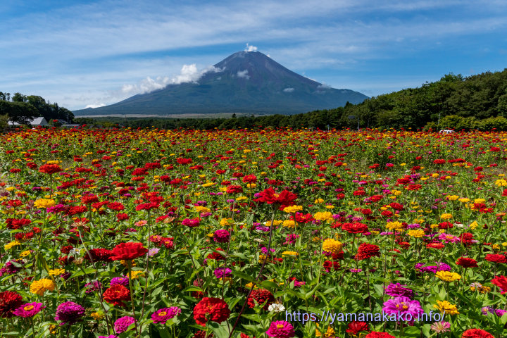 満開の百日草朝のうちは雲に遮られて見えなかった富士山が、9時過ぎぐらいからだんだんと晴れてきて、10時頃には写真のように全景が見えてきたので、花の都公園の百日草がまだきれいに咲いているので、撮ってみました。