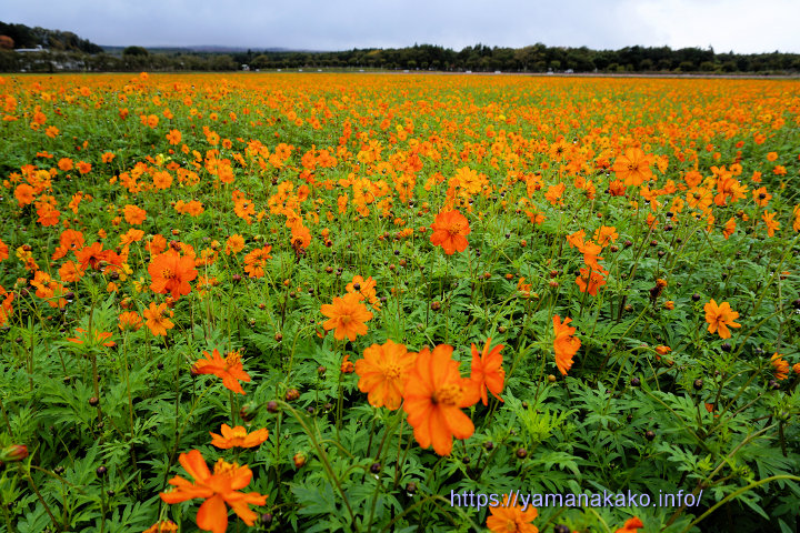 見頃を迎えたオレンジフレア花の都公園のキバナコスモス(オレンジフレア)が、写真のようにだいぶ咲き揃ってきて、14日に投稿したコスモスも見頃となってきました。他にもピンクのソバや百日草などが咲いていますが、明朝からは冷え込む予報なので心配です。