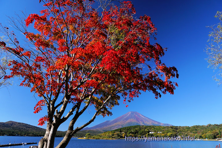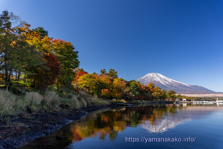 旭日丘湖畔緑地公園から望む富士山明日(28日)より11月13日まで山中湖夕焼けの渚紅葉まつりが開催されます。色付き具合はまだちょっと早い感じですが、写真のように色付いた木もあります。今年は山中湖の水量が多く、湖畔が少しだけなので、湖側からはこのような感じとなります。また同時に、チームラボ山中湖 自立しつつも呼応する生命とお絵かき水族館も湖畔で開催されます。