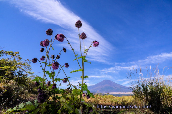 湖畔に咲くフジアザミ毎年、9月から10月にかけて、山中湖交流プラザきらら前の湖畔で、たくさんのフジアザミが咲くのですが、今年は株が小さめでいつもより少なく、咲いているのはごくわずかでした。その中でもこのフジアザミは立派な方ですが、そろそろ終わりのようです。来年はいっぱい咲くといいんですが・・・。