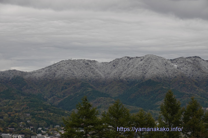 石割山、日向峰方面は雪化粧昨日から今朝にかけて冷たい雨が降り、富士山もずいぶんと裾野の方まで白くなり、山中湖周辺の山々も雪が降ったようで、石割山や日向峰方面は線を引いたように上側だけ真っ白になっていました。手前にあるカラ松はまだ青々としているのに、雪化粧した山が見られるのはとてもめずらしいです。