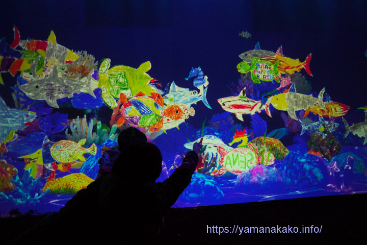 チームラボお絵かき水族館昨日投稿したように、本日より夕焼けの渚紅葉まつりが開催され、同時にチームラボ 山中湖 呼応する生命とお絵かき水族館も開催となります。昨夜は山中湖村民のみ入場可能で、多くの人が訪れ楽しんでいました。お絵かき水族館では自分の描いた魚が泳いでいて、触ると逃げるなどまるで生きているようで、特に子どもたちには人気でした。