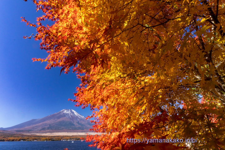 黄葉から紅葉と富士山この木はまだ若干緑が残り、黄色から赤へのグラデーションがとてもきれいでした。山中湖全体では昨日よりずいぶんと紅葉が進み、今朝はかなり落ち葉が舞っていました。北寄りの風だったので木枯らしかな(^_^;)