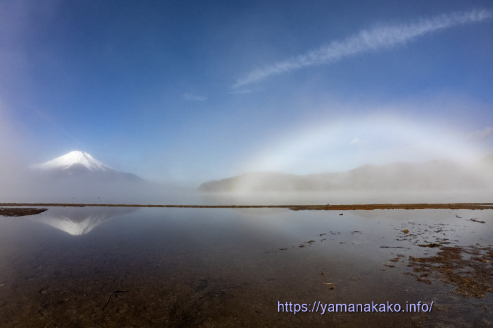 白虹と逆さ富士早朝の山中湖は霧で覆われていて、湖畔から富士山は見えませんでしたが、9時頃の霧が晴れる刹那に白虹(白い虹)と富士山が見られました。夏至の頃は白虹の中に富士山が見られる位置にあったのに、今の時期はこんなに離れていて、一緒に撮るのはかなり画角の広いレンズが必要となって難しいです。