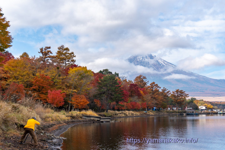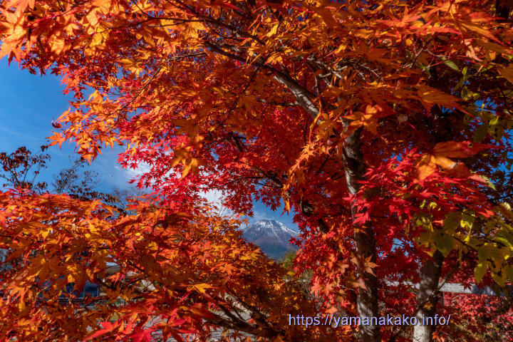 紅葉の中に富士山一昨日より富士山の雪はずいぶんと少なくなりましたが、山中湖周辺の木々はだいぶ色付いてきて見頃となってきました。写真のように若干緑が残っているぐらいがちょうどきれいです。紅葉まつり会場の旭日丘湖畔緑地公園も、ちょうど見頃を迎えた感じで、昼もライトアップされた夜もとてもきれいです。また連日多くの人が訪れている同時開催中のチームラボ山中湖は、入場制限される場合もございますのでご注意ください。