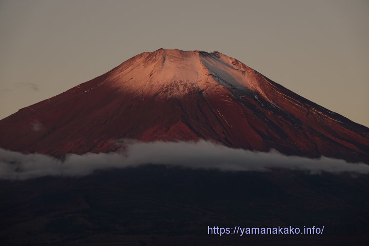 紅葉と雪化粧した富士山昨日の夕方に見えた富士山は雪を被っていませんでしたが、今朝は山頂付近が雪化粧して真っ白になっていました。山中湖周辺の木々はだいぶ色付いてきて、きららでは写真のように真っ赤に染まっていてとてもきれいです。
