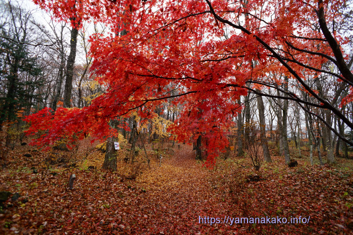 きららの紅葉11月2日投稿の場所とほぼ同じところから撮ってみて、まだ真っ赤できれいですが、葉が落ちてピークを過ぎたような感じです。紅葉まつり会場の旭日丘湖畔緑地公園も落ち葉が増えてきました。